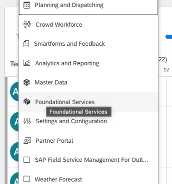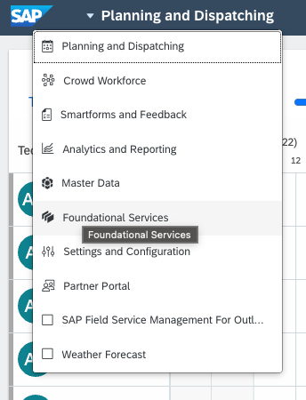 In the main menu of SAP FSM (or via the Shell main screen), select ‘Foundational Services’.